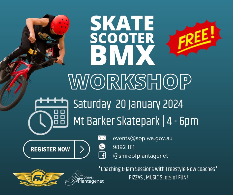 All ages and abilities welcome. BYO helmet and pads, scooters and BMX bikes. Parents or guardians must sign in participants on arrival and sign out on departure.